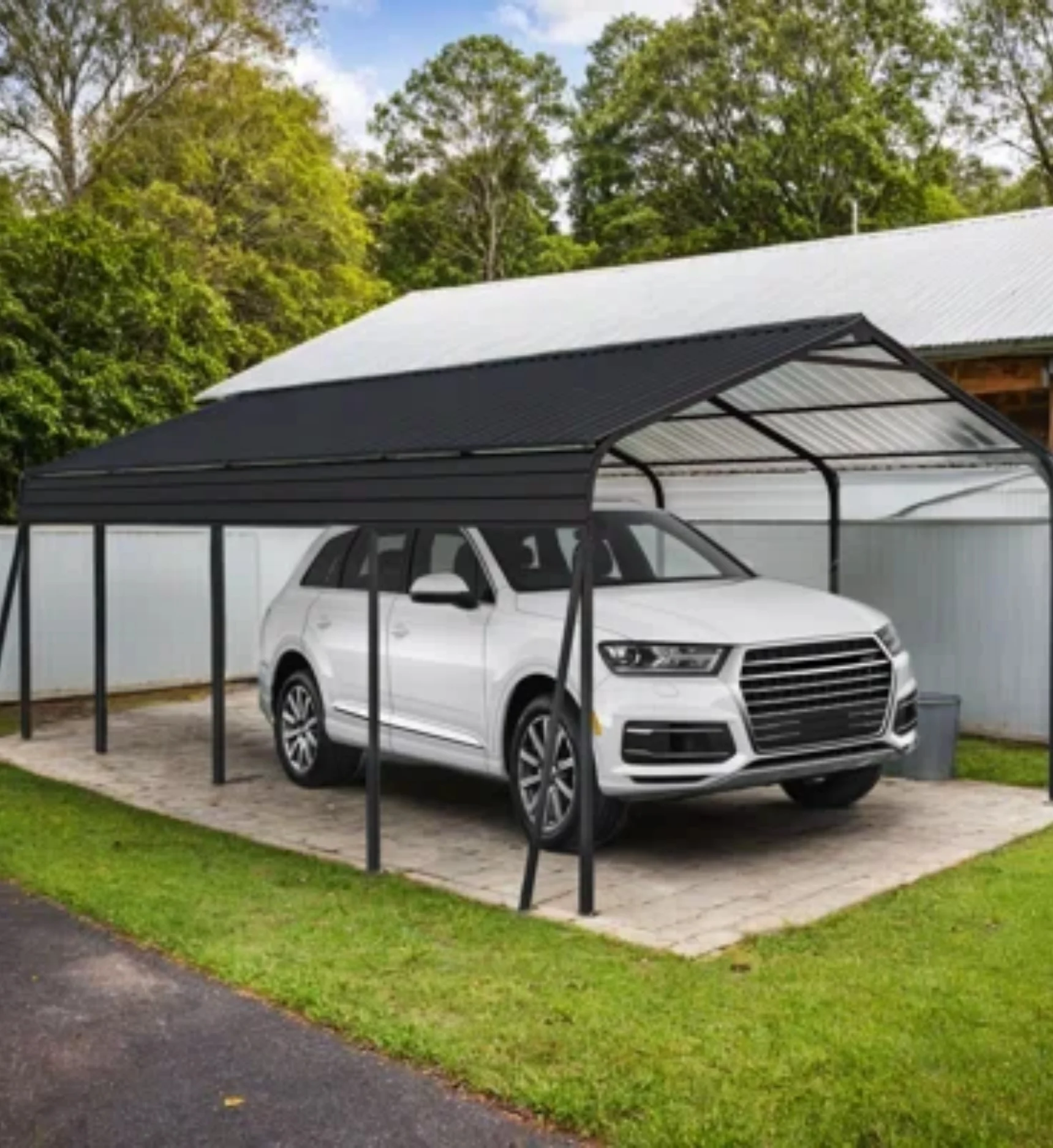 A single carport covers one vehicle and fits neatly in most driveways. It is a great choice for homeowners who want simple and solid protection without taking up too much space.